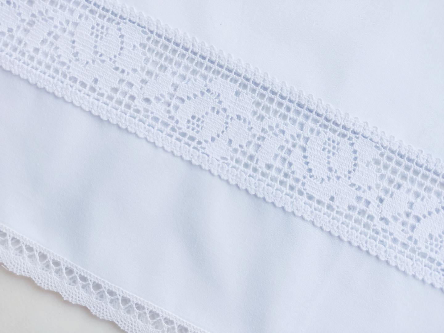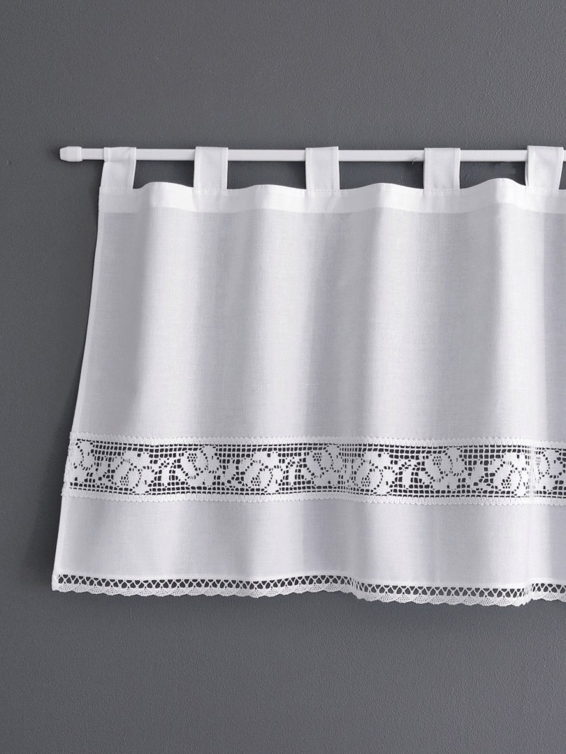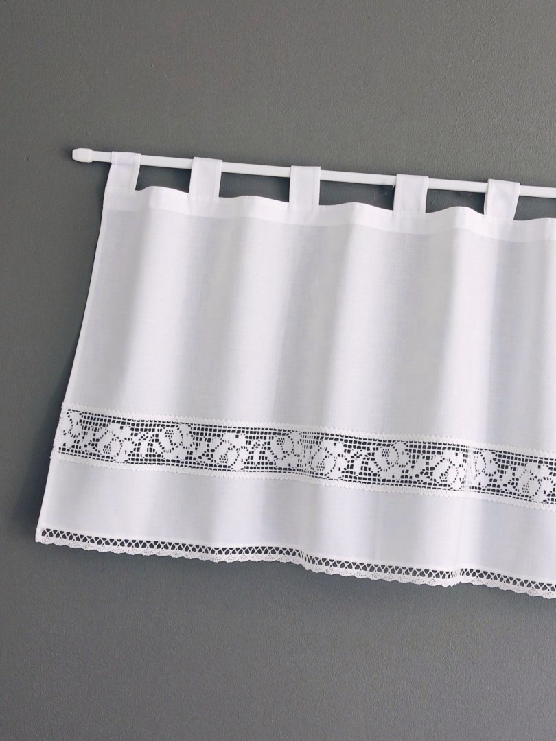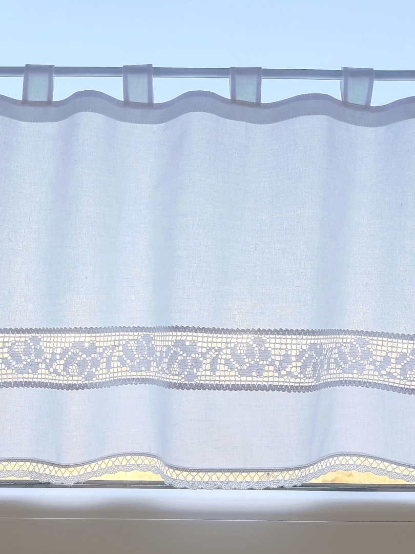 Bawełniana zazdrostka w stylu vintage z pięknym koronkowym ażurem w ponadczasowe róże. Zazdrostka jest wykonana z delikatnej, 100% bawełny i ozdobiona dwiema rodzajami bawełnianych koronek. Ażurowa różana wstawka szczególnie pięknie prezentuje się, kiedy przebija przez nią dzienne światło. Tkanina bawełniana jest kryjąca, zasłania widok, ale jest cienka i nadmiernie nie zaciemnia okna.