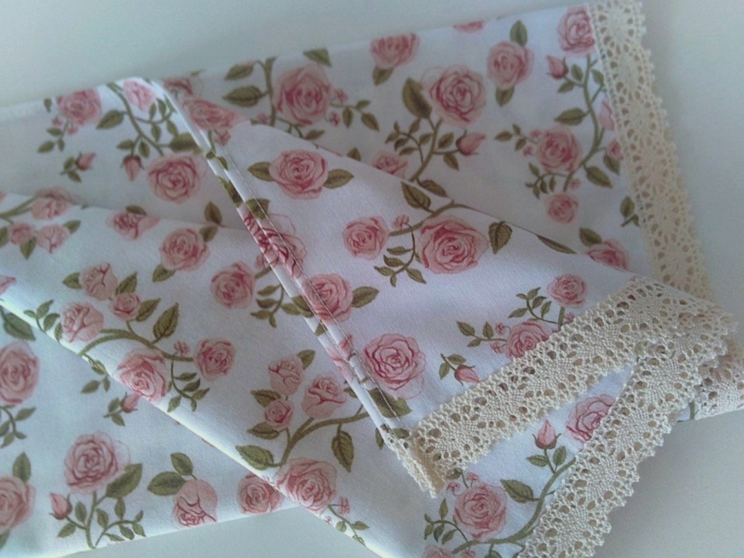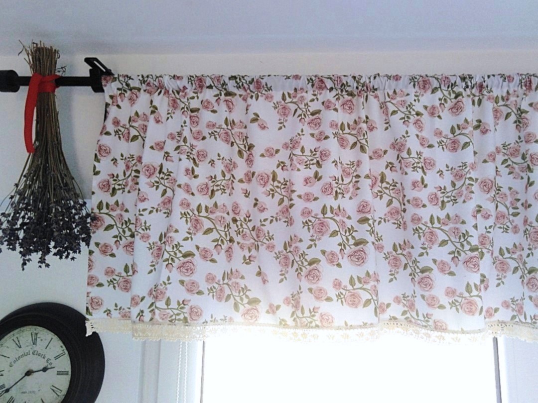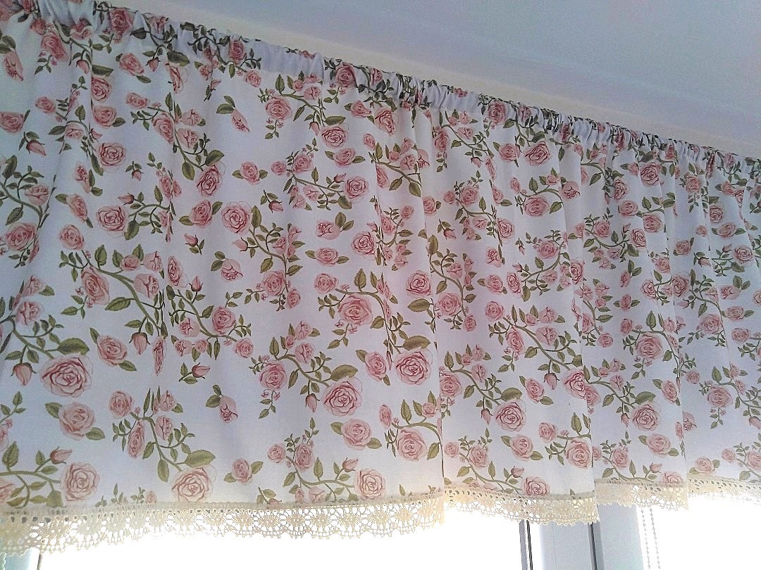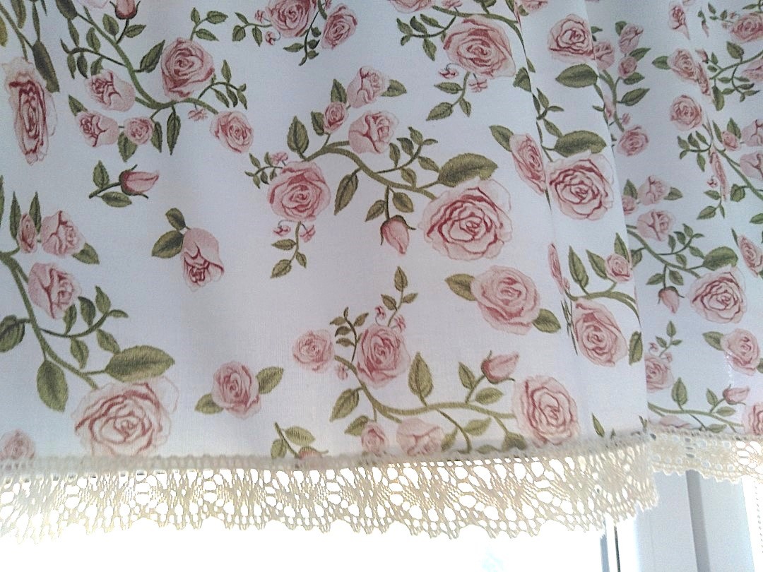 Lambrekin do kuchni w kliamcie retro i vintage wykonany z delikatnej tkaniny o jesiennej kolorystyce (bawełna 100%). Wzór delikatnie różowych różyczek oraz gałązek w odcieniu zgniłej zieleni na dole podkreślony koronką w kolorze ecru. Lambrekin jest cienki i delikatny, zasłania widok, ale nie zaciemnia pomieszczenia.