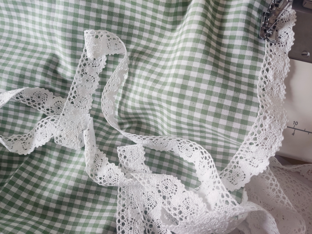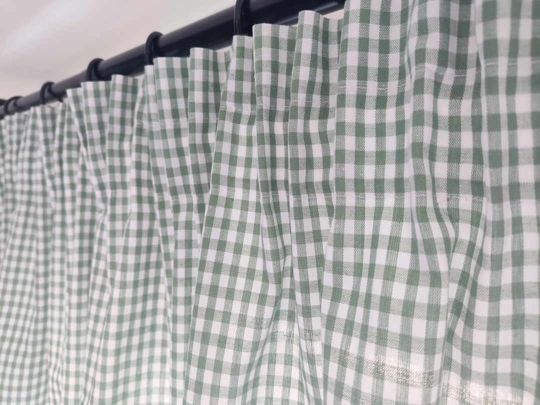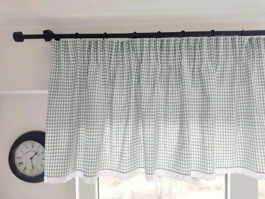 → Na zdjęciu głównym: lambrekin w zieloną kratkę na taśmie marszczącej (do przypięcia żabek).