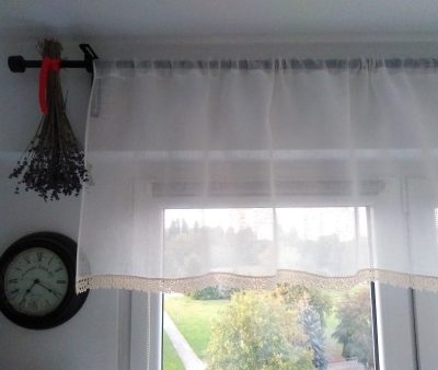 Zazdrostka w stylu rustykalnym uszyta z delikatnego, polskiego, białego lnu (LEN100%) z szeroką, bawełnianą koronką u dołu. Tkanina jest miękka, układająca się, kryjąca, zasłania widok, ale nadmiernie nie zaciemnia okna. Ta lniana, gustowna zazdrostka dedykowana jest wnętrzom w stylu rustykalnym i wiejskim, jest jednak na tyle delikatna i subtelna, że jako dekoracja okna kuchennego sprawdzi się również w innych stylach wnętrzarskich, np. w stylu retro, vintage i romantycznym.