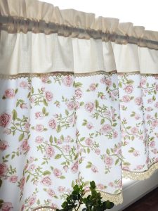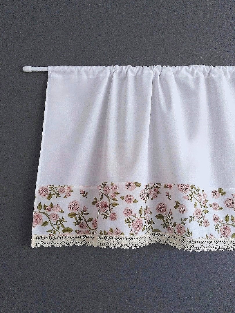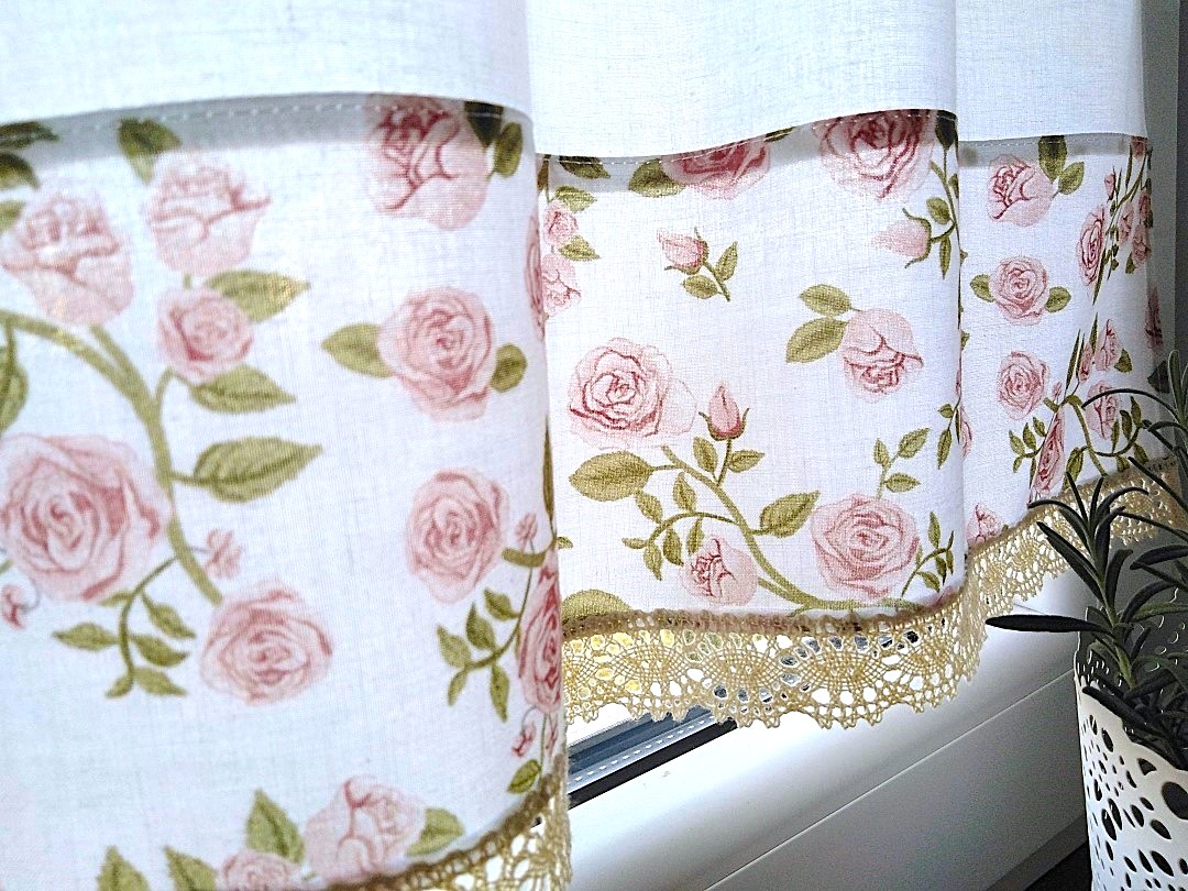 Wdzięczna w odbiorze, jesienna zazdrostka retro na okno kuchenne w stnonowanej, jesiennej retro kolorystyce, uszyta z wysokiej jakości tkanin bawełnianych (bawełna 100%). Góra: biała, dół: uroczy wzór delikatnie różowych różyczek z zielonymi gałązkami w odcieniu zgniłej zieleni podkreślony bawełnianą koronką w kolorze ecru. Zazdrostka jest cienka, delikatna, kryjąca widok, ale przepuszcza światło i nie powoduje zaciemnienia.