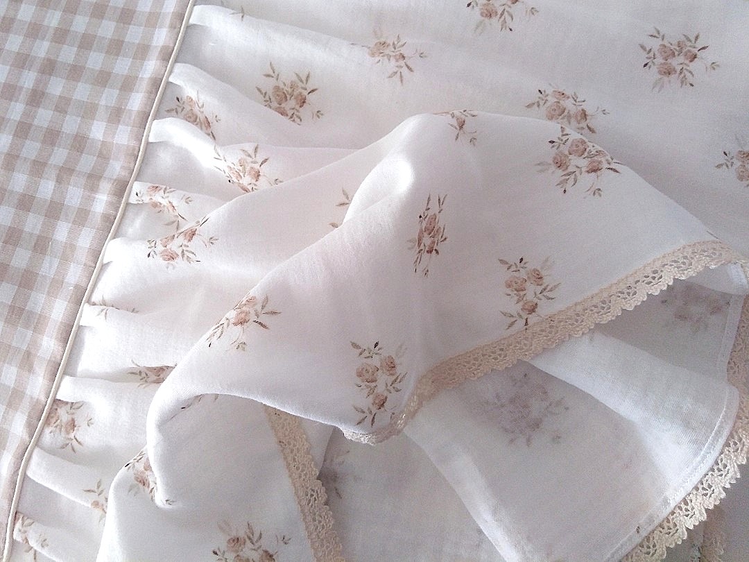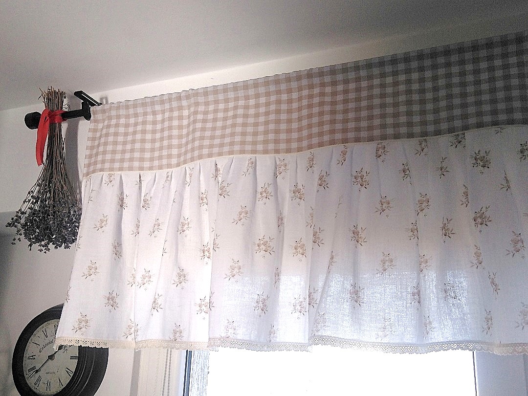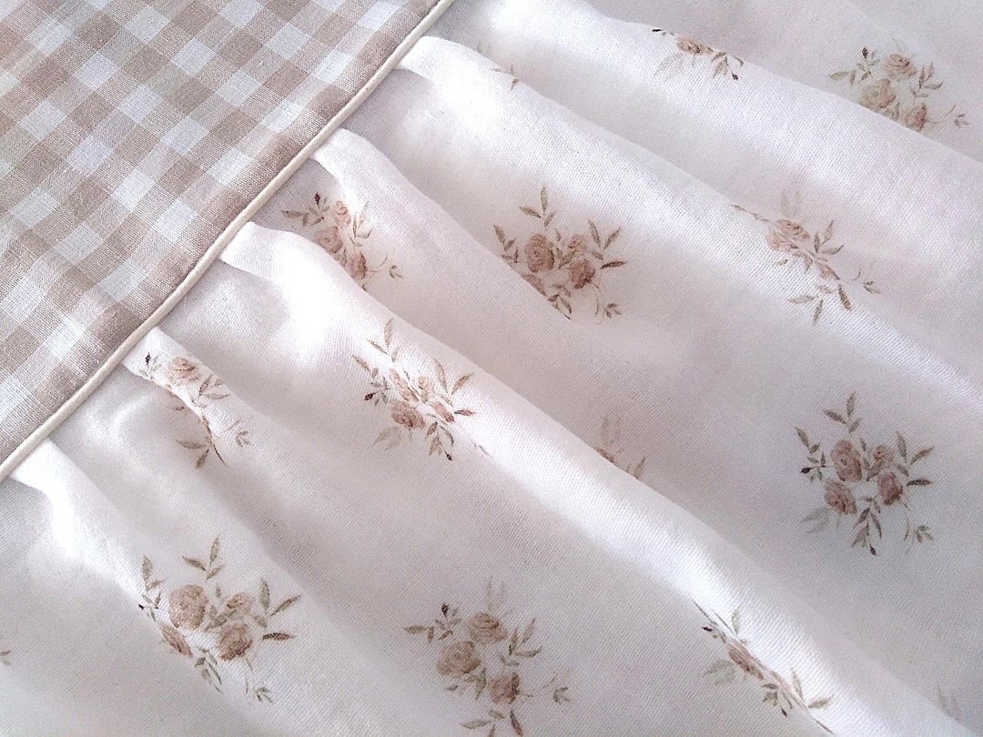 Uroczy lambrekin kuchenny uszyty z przepięknego muślinu (bawełna 100%) w delikatne kwiaty (beżowe i brązowe bukiety róż) oraz tkaniny w beżową kratkę. Na łączeniu tkanin, nadająca elegancji, wypustka w kolorze ecru, dół wykończony koronką również w kolorze ecru. Piękna i oryginalna dekoracja okna do kuchni bądź jadalni w stylu retro lub vintage.