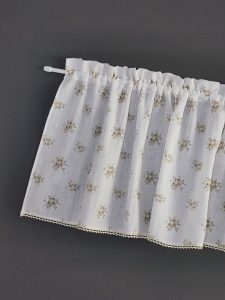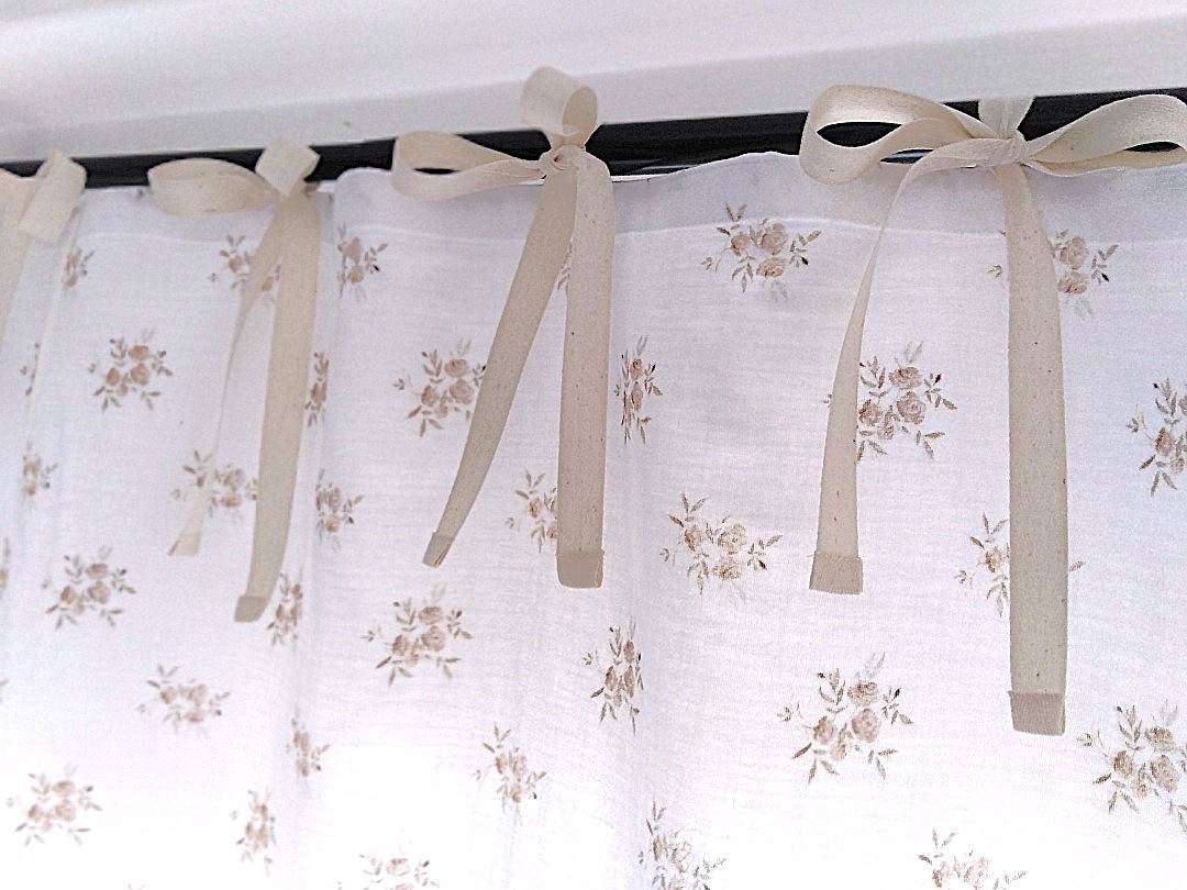 Pełen uroku lambrekin do kuchni uszyty z białego muślinu (bawełna 100%) w delikatne kwiaty (beżowe i brązowe bukiety róż) oraz bawełnianej koronki w kolorze ecru. Piękna i nietuzinkowa dekoracja okna do kuchni bądź jadalni w stylu retro lub vintage.