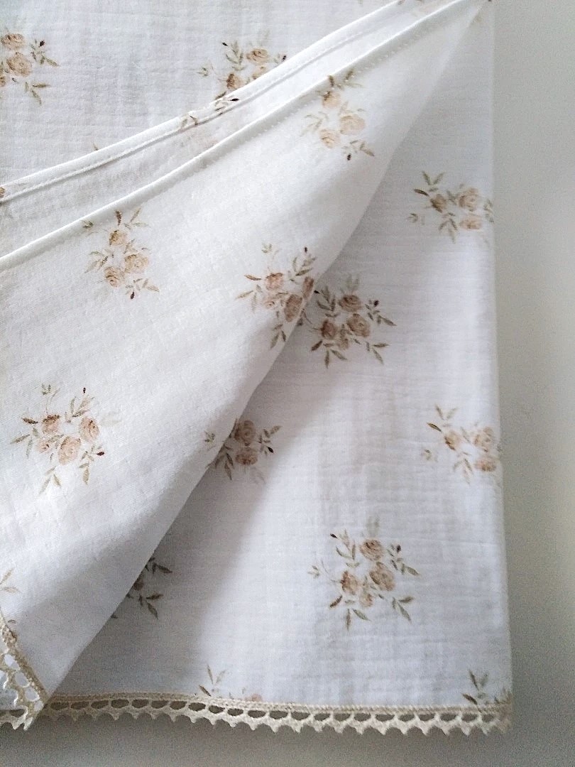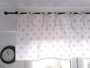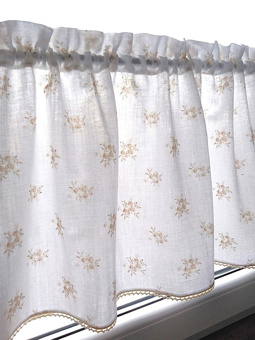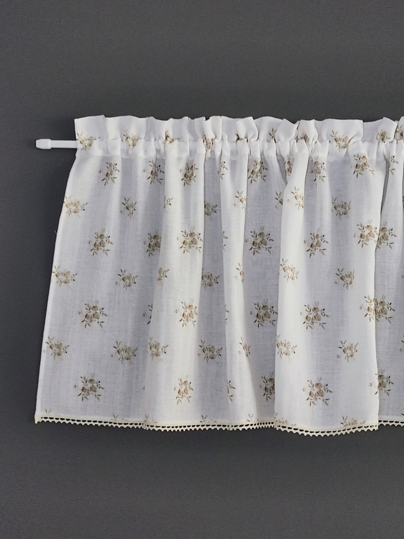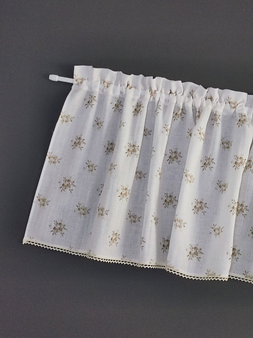 Delikatna, stonowana i zwiewna zazdrostka wykonana z białego muślinu bawełnianego (bawełna 100%) w urocze kwiaty (malutkie beżowe i brązowe różane bukieciki) oraz bawełnianej koronki w kolorze ecru. Zazdrostka zasłania widok i łagodnie filtruje światło.